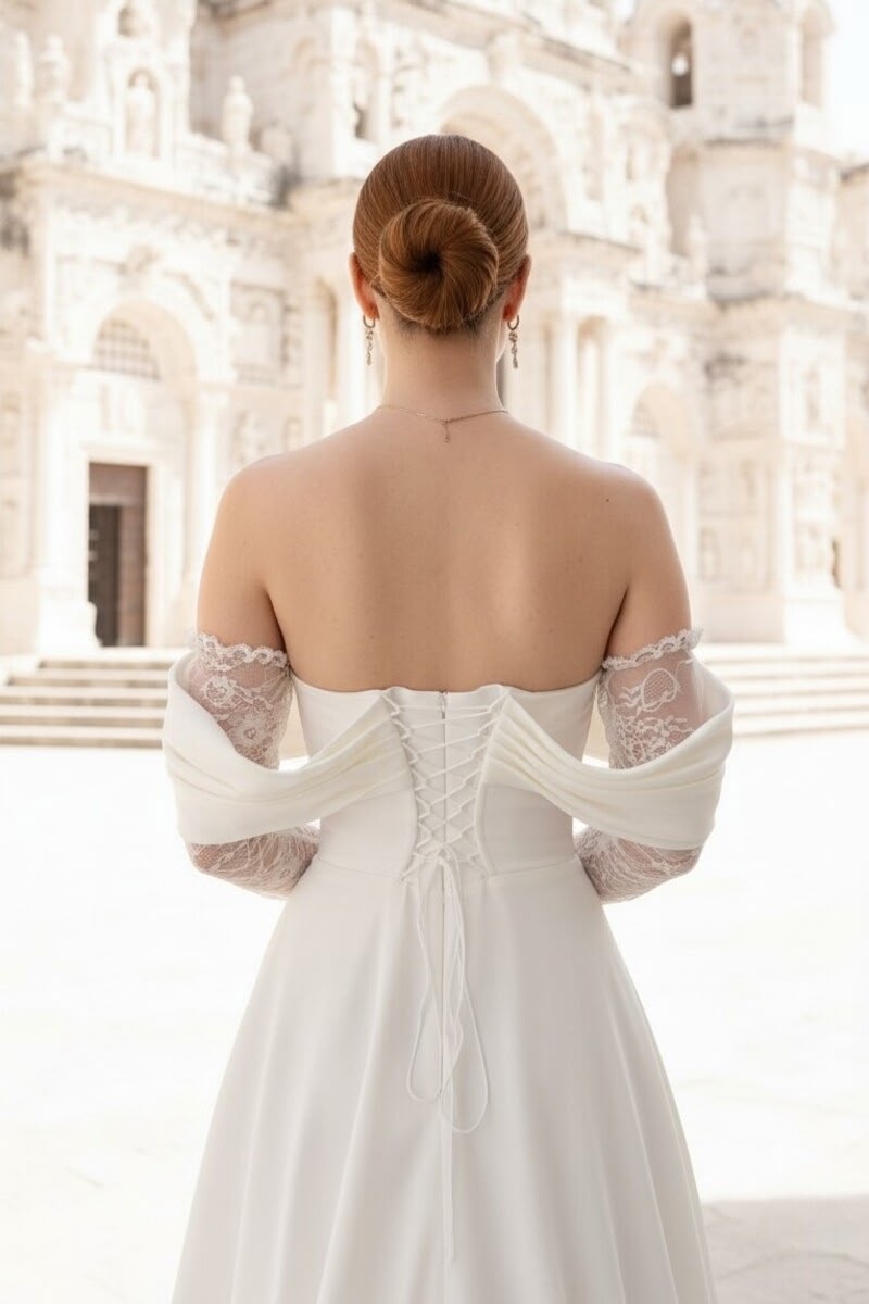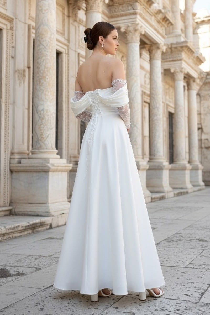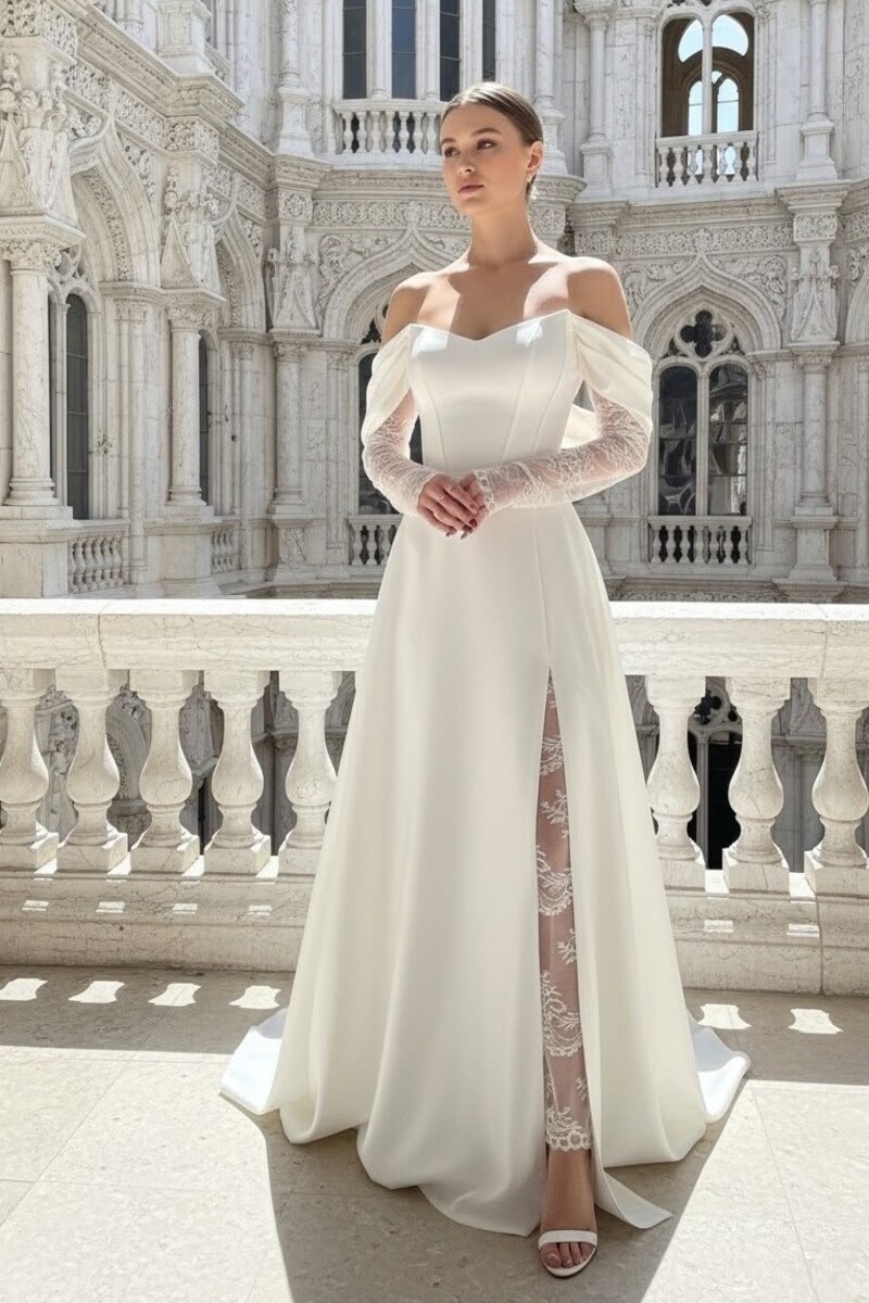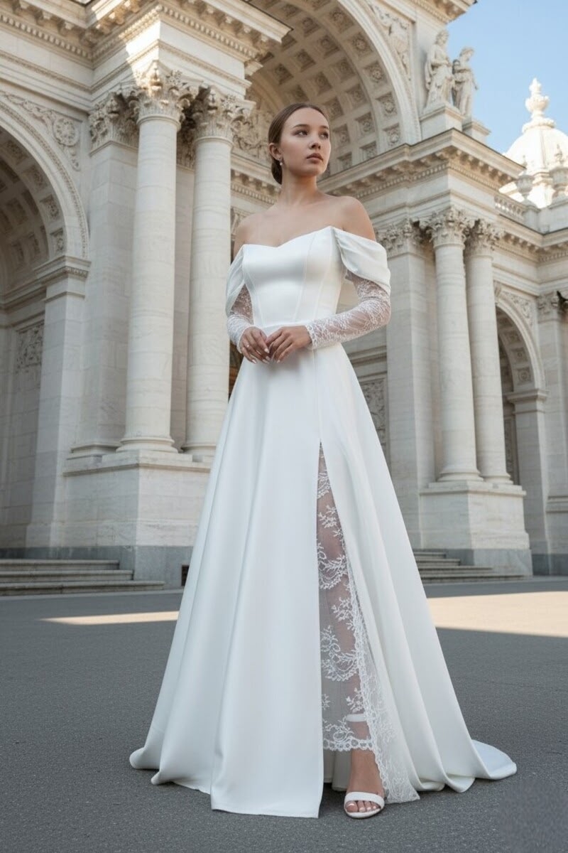 Высокий разрез эффектно прикрыт кружевной вставкой, юбка А-силуэта с небольшим шлейфом. Съёмный рукав.