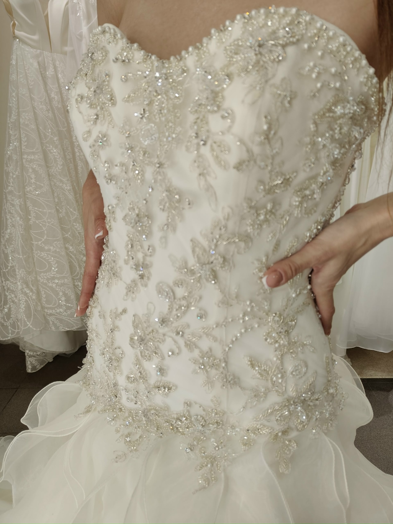 Описание: Модель с юбкой, облегающей бёдра, с оригинальной расшивкой по лифу - дорогие отделочные материалы, ткань поюбке - шёлковая органза, лёгким шлейфом. Застёжка - шнуровка по спинке. Длина изделия на рост 169 см. + под каблук 10 см. Страна производитель: Франция.