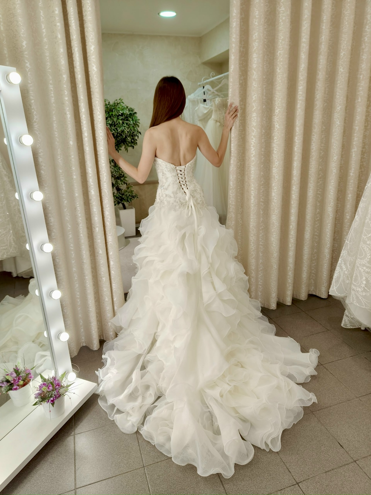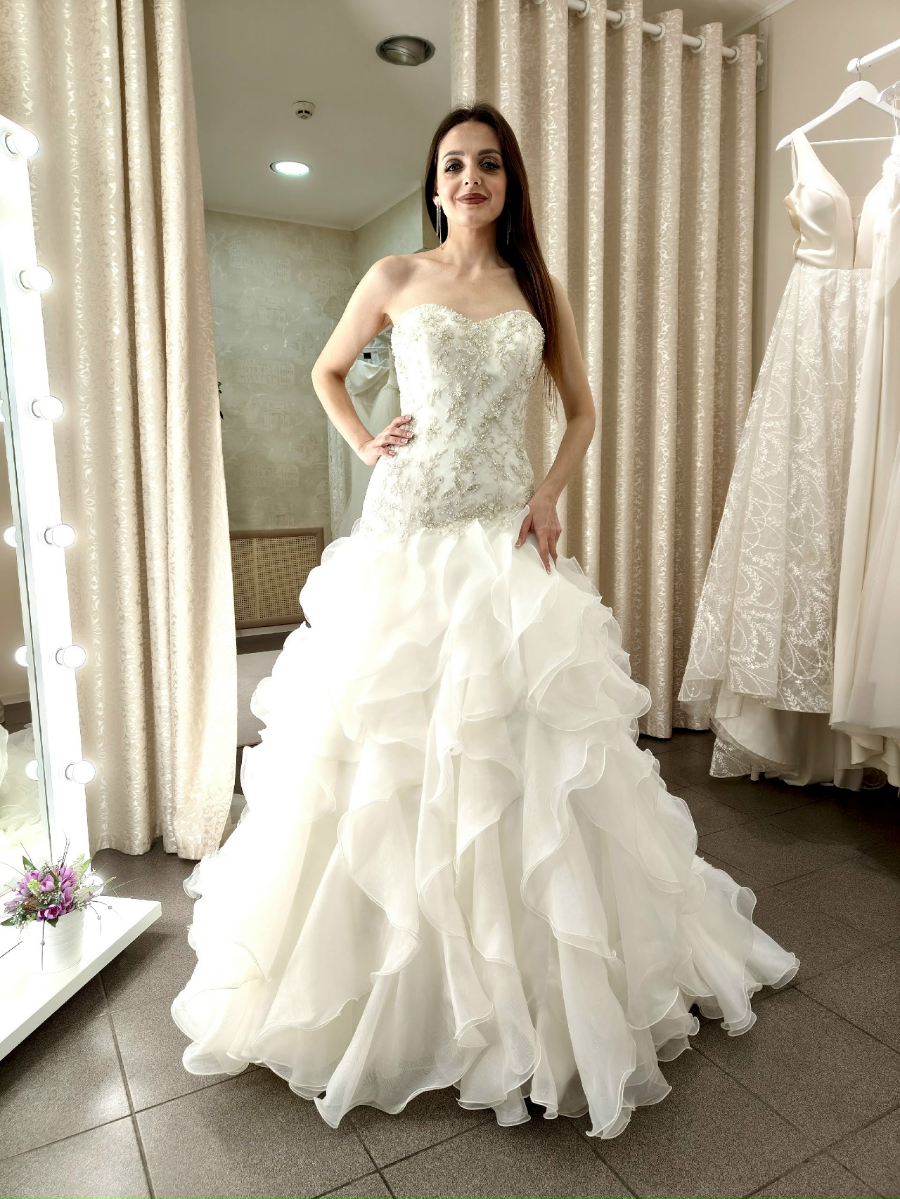 Расшитый корсет, пышная юбка от бедра, эффектный шлейф.