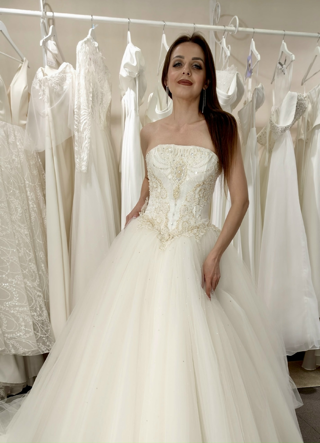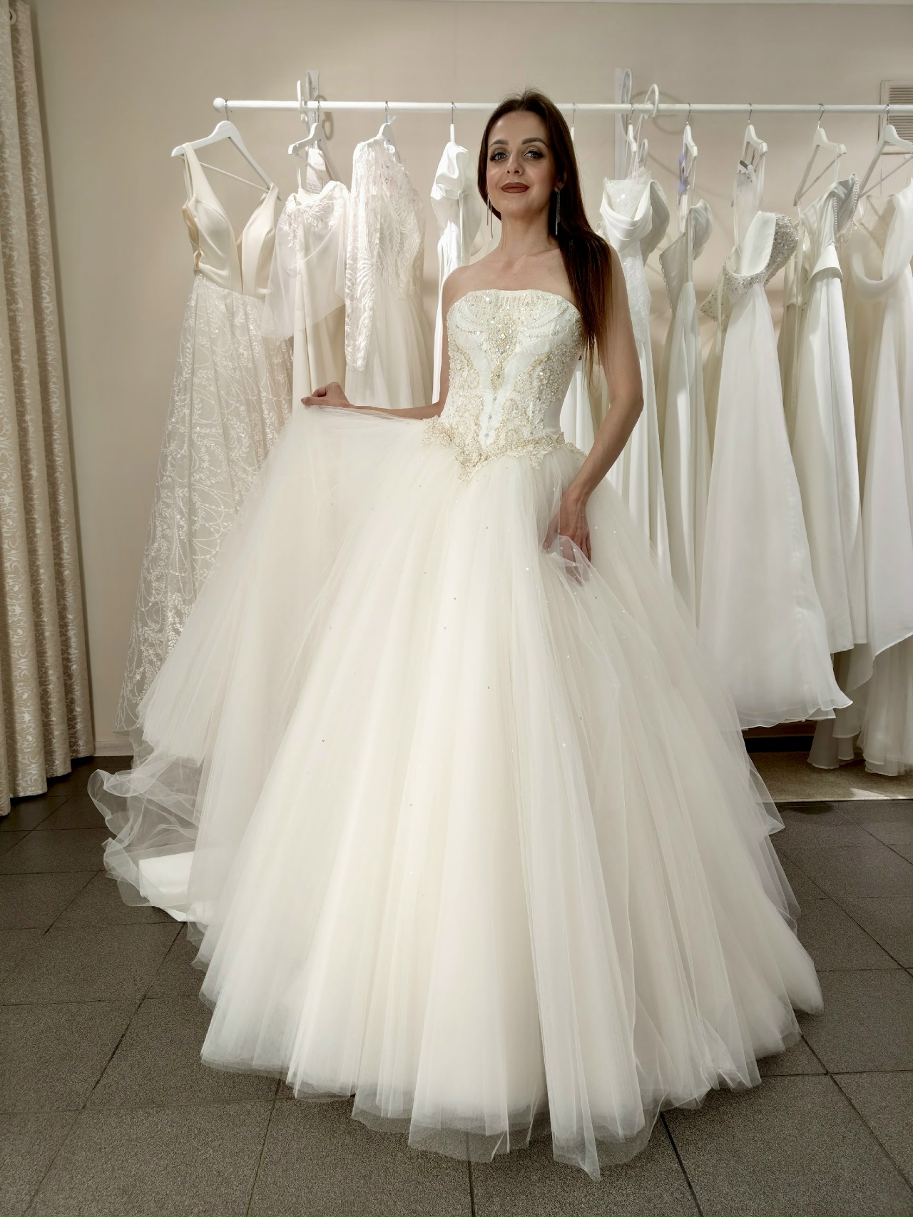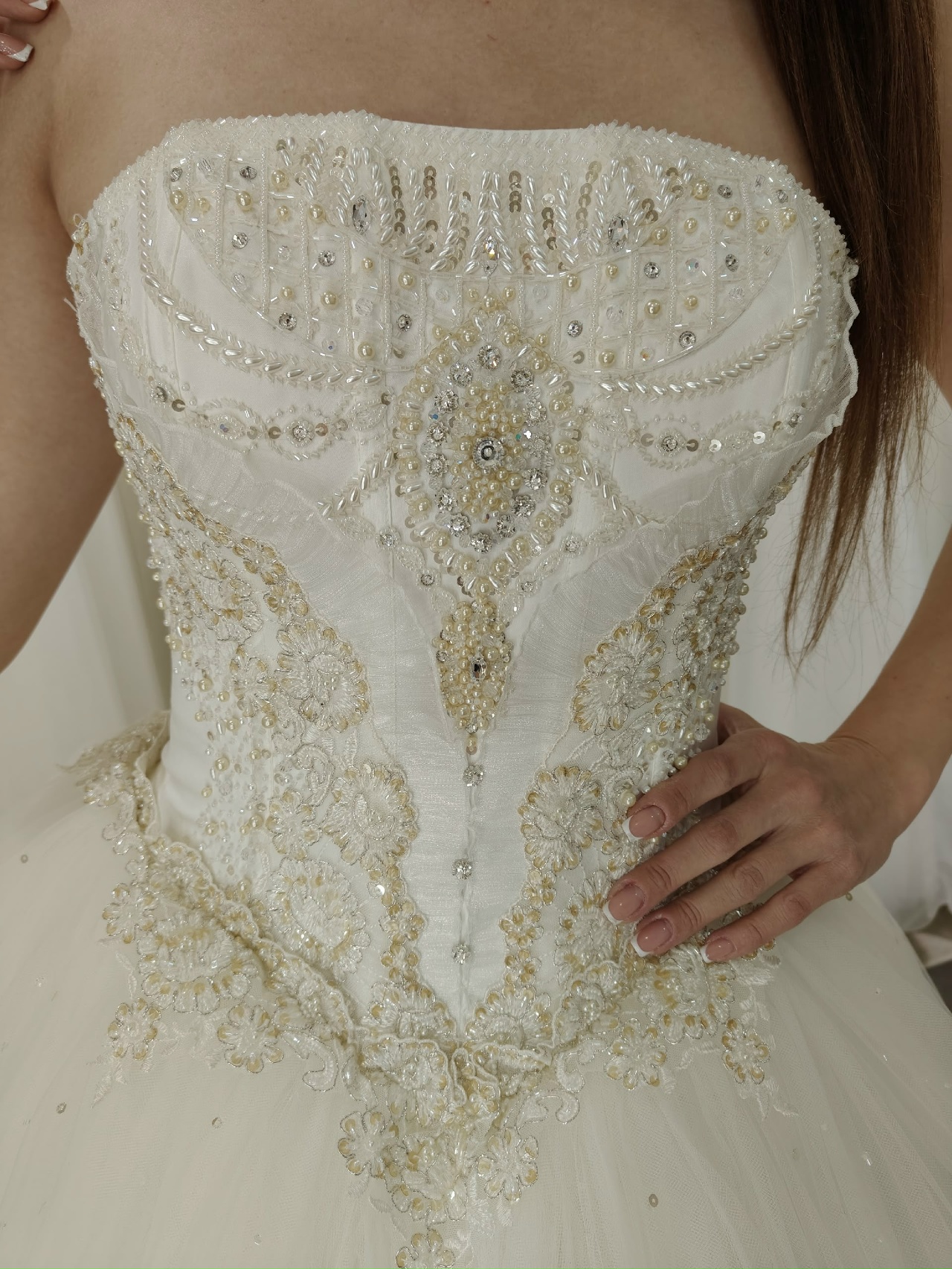 Расшитый корсет, пышная юбка от бедра, эффектный шлейф.