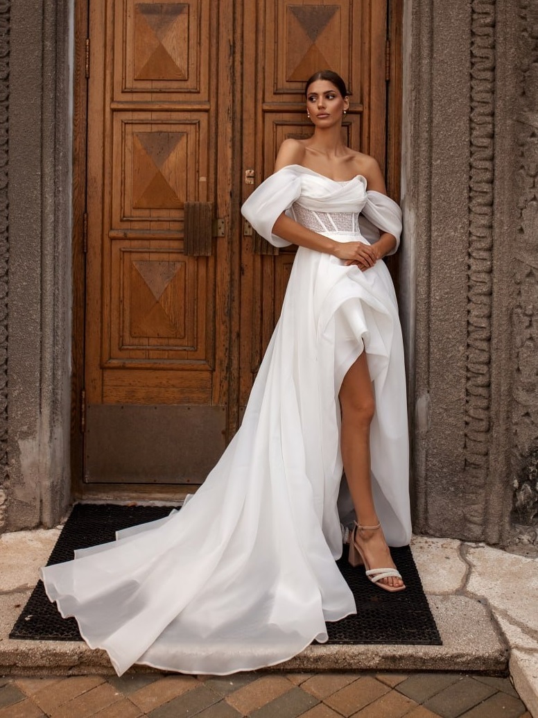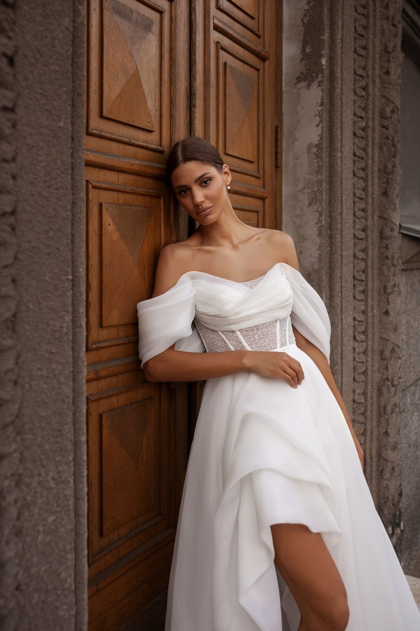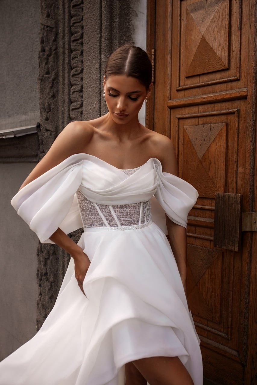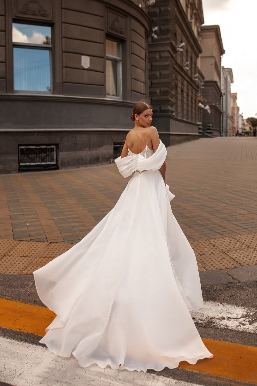 Описание: Модель А-силуэта с интересным многослойным лифом и очаровательными крылышками, на корсете полупрозрачность, блеск, юбка с небольшим шлейфом и очаровательным разрезом спереди; материалы: органза, глиттер. Застёжка - шнуровка. Длина изделия на рост 170 см. + под каблук 12 см. Возможные размеры к заказу: 40, 42, 44, 46,48. Страна производитель: Белоруссия.