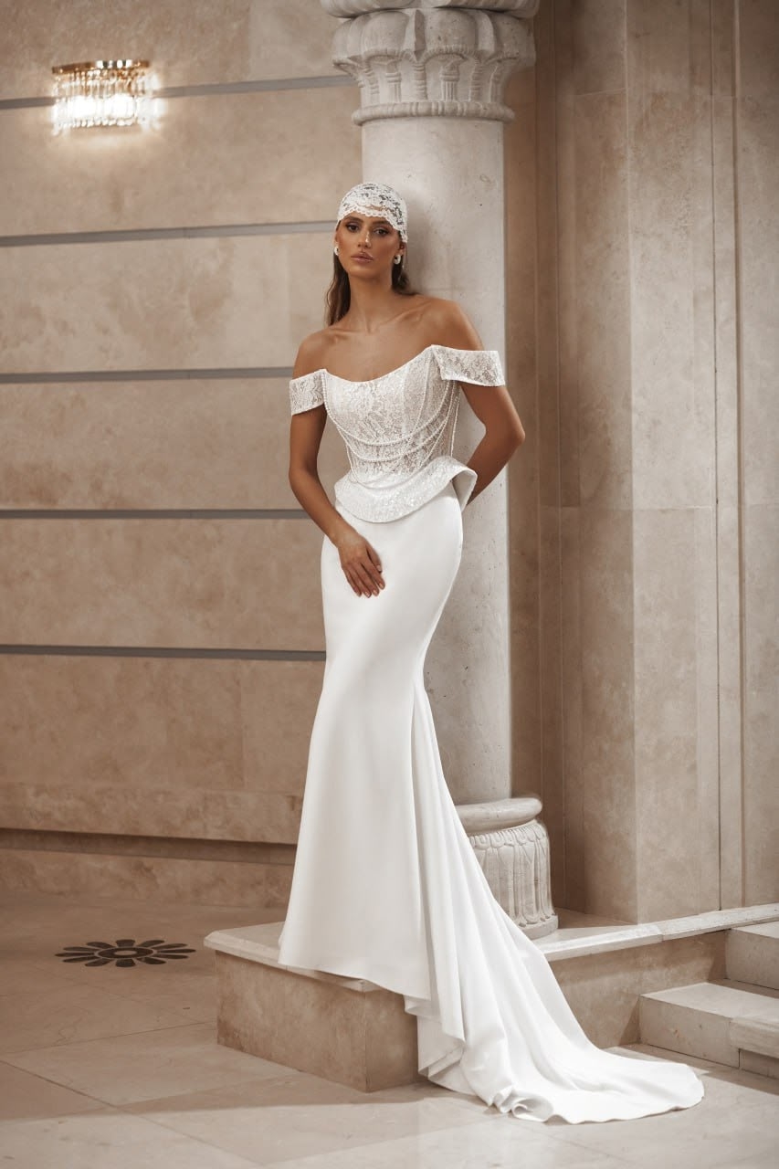 Подробное описание: Модель силуэта "рыбка" с модным дизайнерским корсетом, облегающим фигуру и изысканно декорированным лифом. Юбка с шлейфом. Застёжка - шнуровка. Длина изделия на рост 170 см. + каблук до 12 см. Возможные размеры к заказу: 40, 42, 44, 46. Страна производитель: Белоруссия (г. Брест).