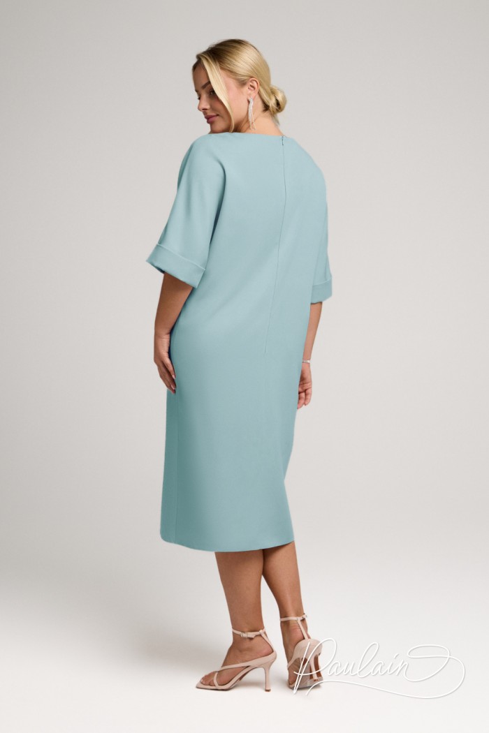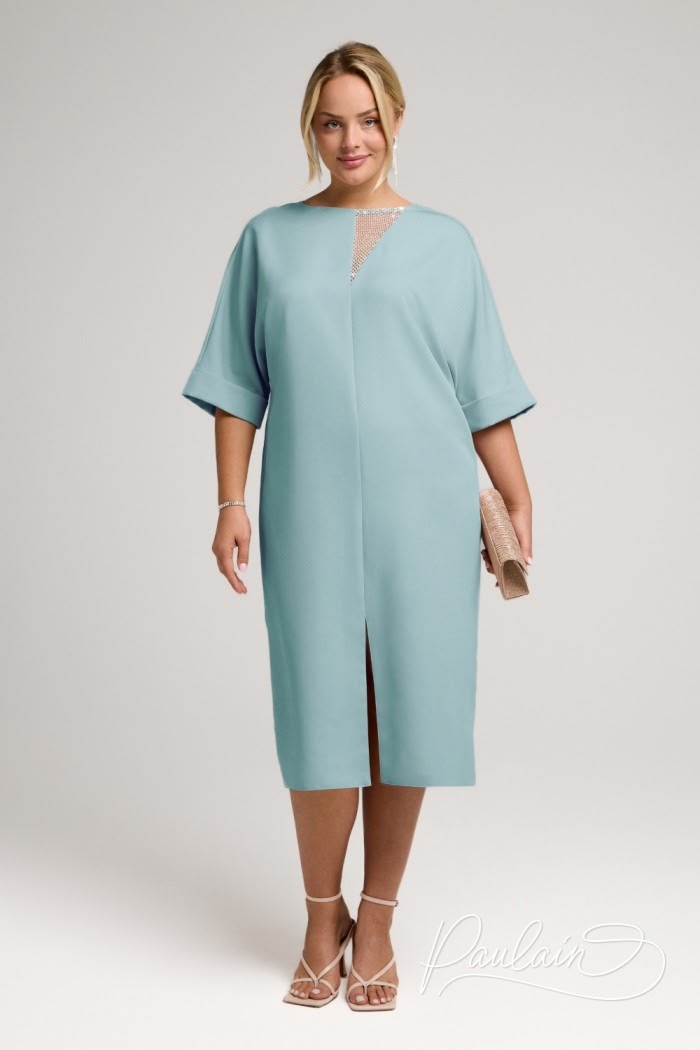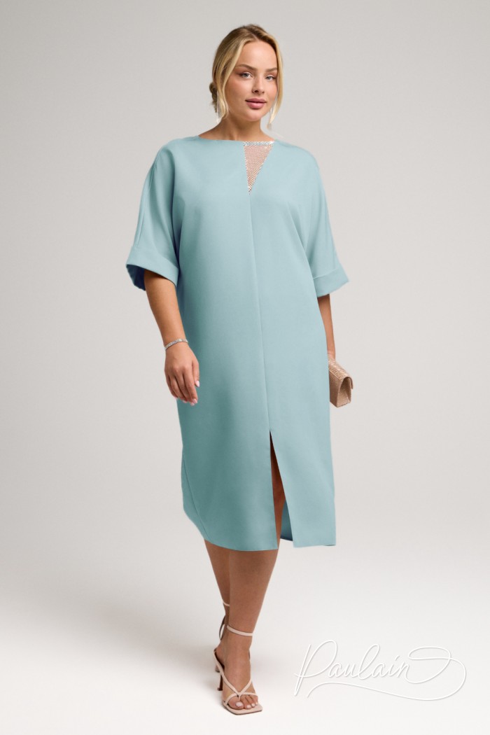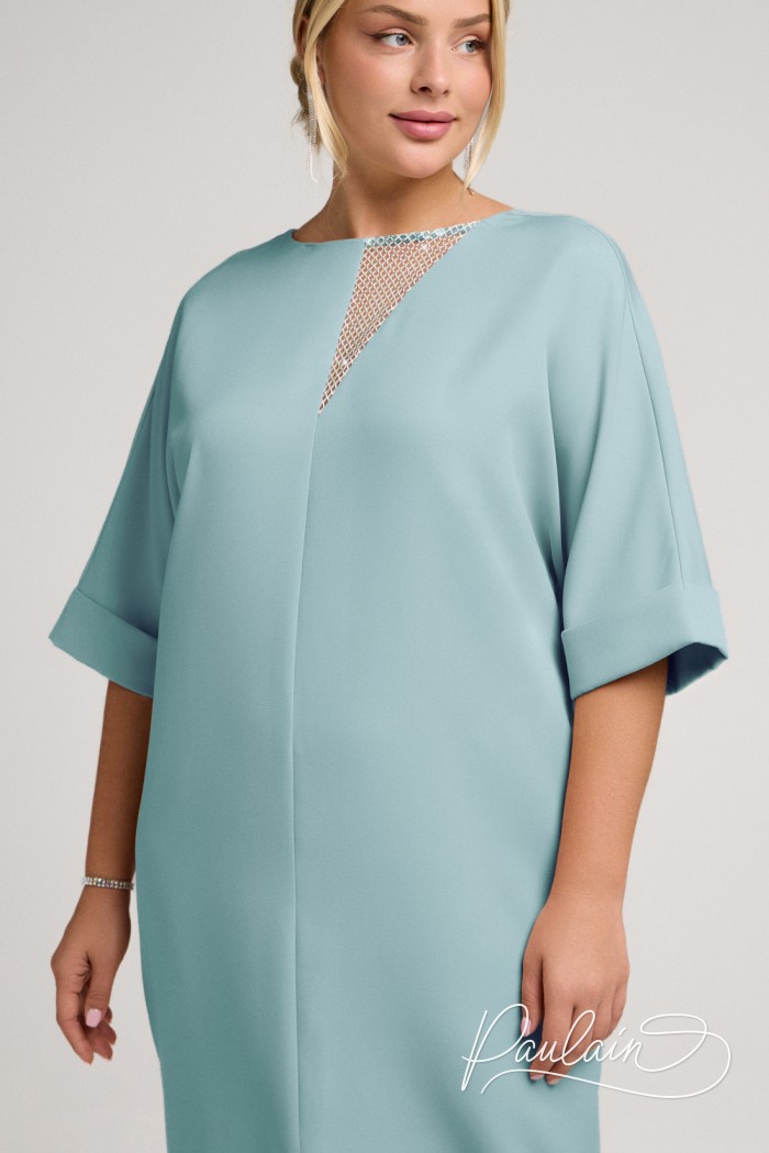 Свободное платье свежего оттенка с коротким рукавом и блестящей вставкой на декольте.