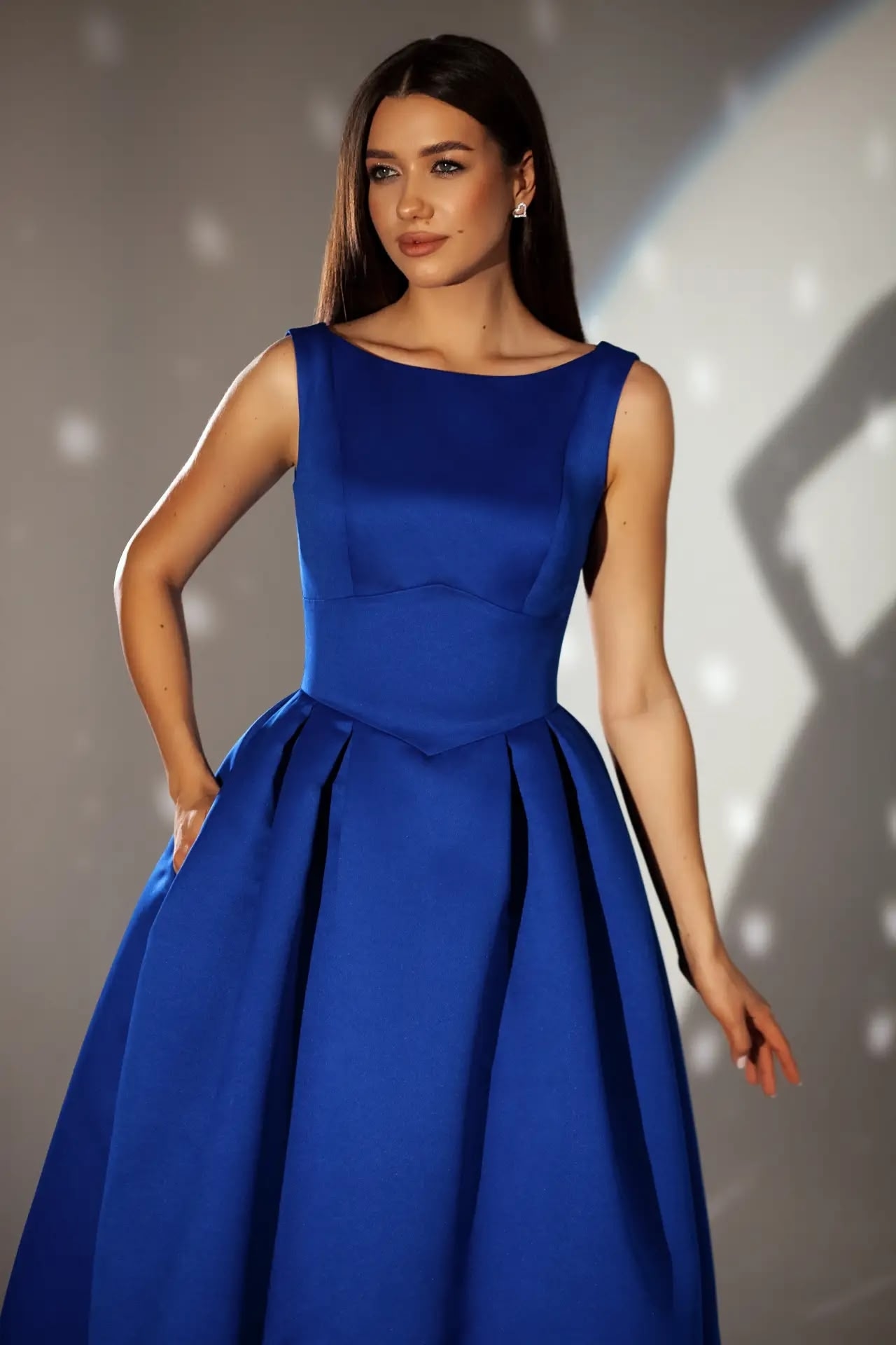 Платье "Кимми" из эффектной атласной ткани длины миди. С карманами и красиво оформленной спинкой.