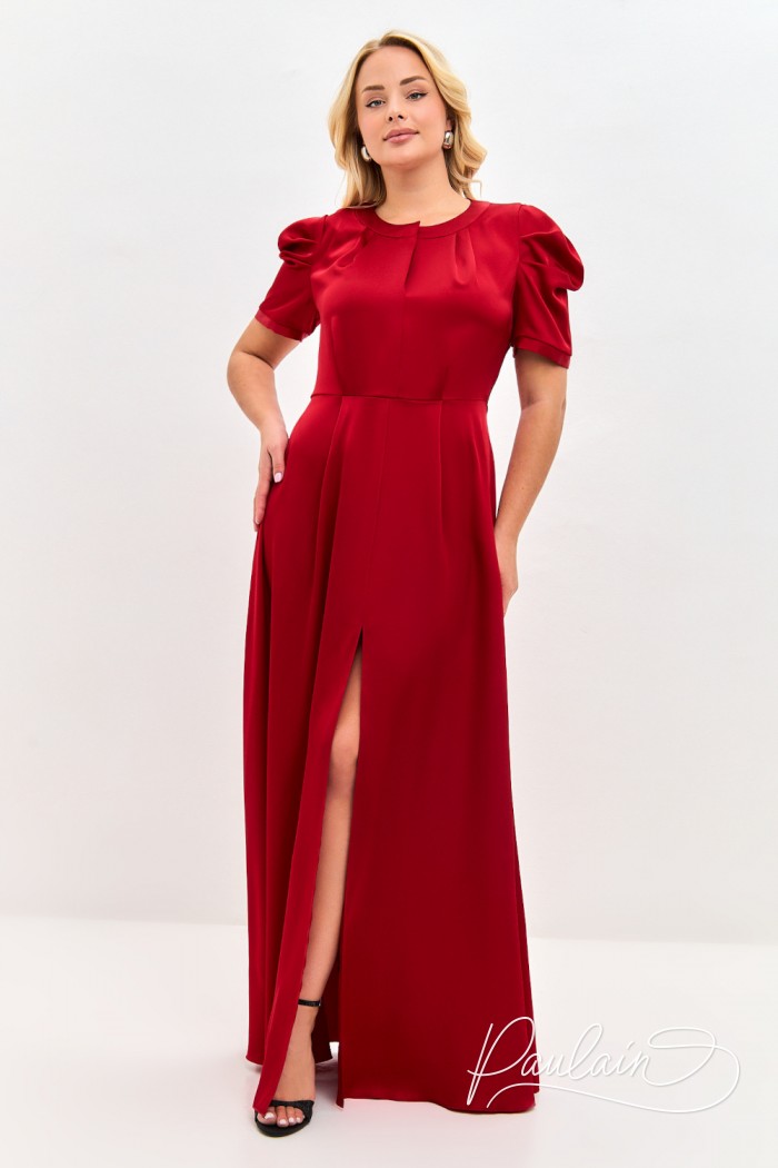 Элегантное закрытое платье в пол с коротким рукавом и разрезом по ноге.